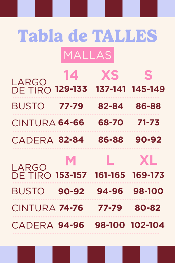 ATENCIÓN: las medidas que figuran en la tabla son “aproximadas” no va haber un talle que te coincida al %100 con la tabla, hay que tener en cuenta que la lycra sede un montón y se amolda/adapta al cuerpo, lo más importante para que chequees es que te coincida el largo de tiro.